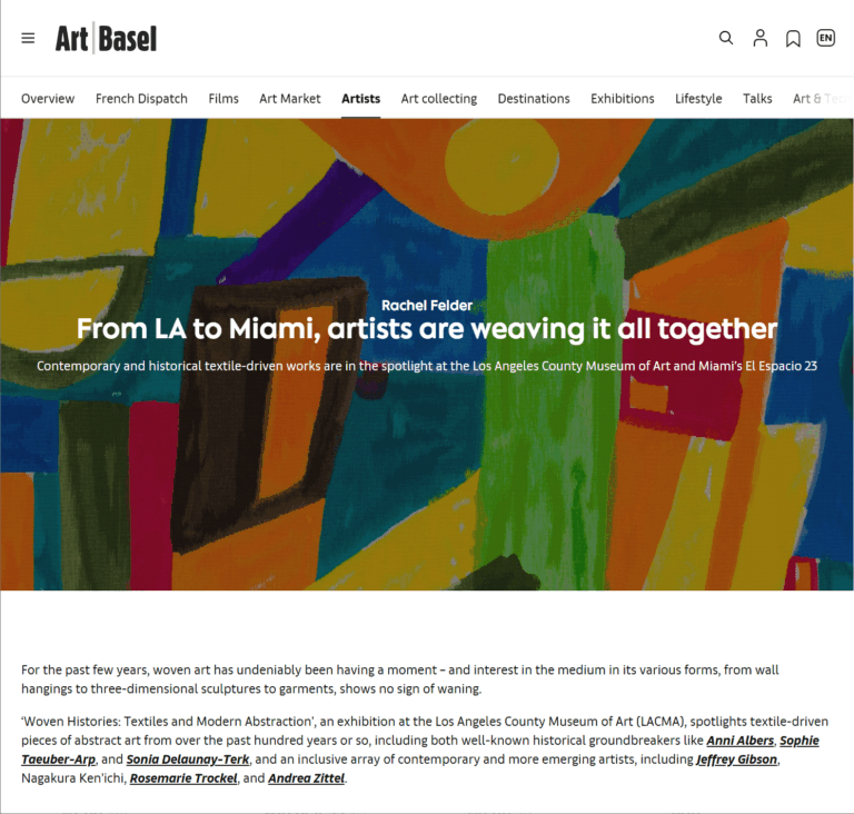 15 Jan Art Basel Magazine: From LA to Miami, artists are weaving it all together Posted at 00:41h in Uncategorized by Fernando Pupo Art Basel Magazine: From LA to Miami, artists are weaving it all together Access the full article