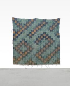 The title of Igshaan Adams’ Akbar is an Arabic male name, a reference that addresses the South African artist’s Muslim faith. A queer artist who was born of a Muslim father and raised by his Christian grandmother, Adam’s elaborate textiles address the diverse cultural and spiritual contexts that continue to form his identity. The artist has embraced Islamic spirituality and particularly Sufism, and his works might be read as enlarged prayer rugs. This is particularly felt with the second piece in this gallery, titled Theshold II, whose symmetrically woven forms recall the floral patterning of Islamic carpets and their references to a garden paradise. The large central opening in this beaded piece, combined with its title speak to intersections between material and spiritual realms.