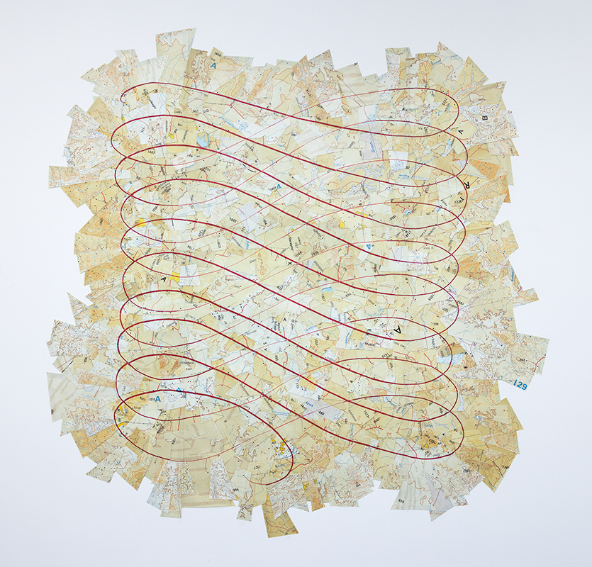 Flourish I (from the series, Calligraphy and Cartography) reconfigures street maps by using the red lines that denote roads and pathways to create a map of his own landscape with strokes that resemble a calligrapher’s hand rather than a cartographer’s line. By stripping the map of its navigational purpose, he plays with structured notions of territory, repurposing cartographic pathways into abstract marks. In doing so, he gives calligraphy a cartographic context, allowing movement, place, and line to converge in a system where no body can traverse, yet the presence of the body is always suggested.