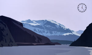 The tunnels become longer and when the road emerged, it would cling to the mountainside almost vertically above the water. Each tunnel had a series of signs which told you increasingly how many kilometres you had come and decreasingly how many were left to go. I suppose this would help you to decide which way to walk out if you broke down, it was also encouraging. I entered a tunnel that counted down from seven kilometres. The usual, slightly grim, excitement of being in a long tunnel turned to impatience but on leaving it I found myself on a narrow ledge in a queue of cars waiting to board a serious looking ferry. The road stopped dead so there was no choice but to pay the tough looking man who sold the tickets and board the ferry., 2004 Dye and an electric clock on nylon on a wooden stretcher